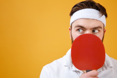 Image of confused young sportsman dressed in white t-shirt standing isolated over yellow background holding racket for table tennis covering mouth. Looking aside.