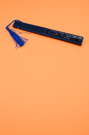A vertical shot of a blue hand fan with floral patterns isolated on an orange background