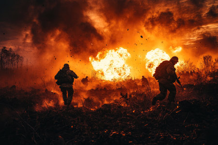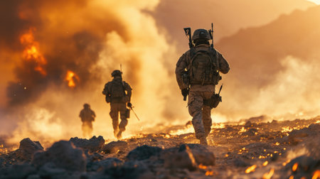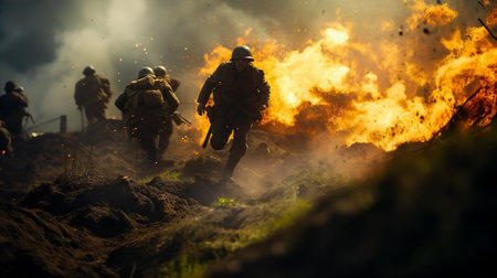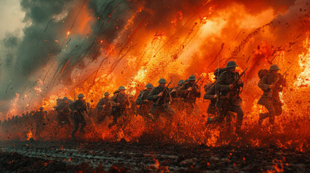 group of soldiers bravely strides through a field engulfed in flames, their uniforms and weapons illuminated by the intense heat.