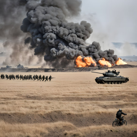Tank advancing through desert battlefield with smoke and explosions - military power and warfare
