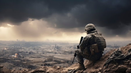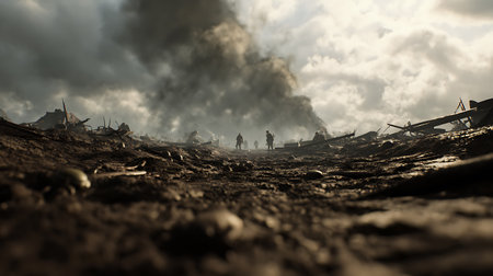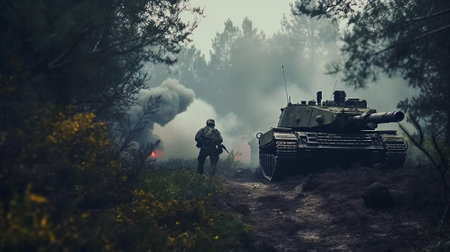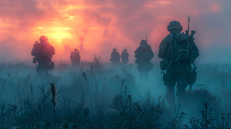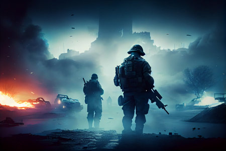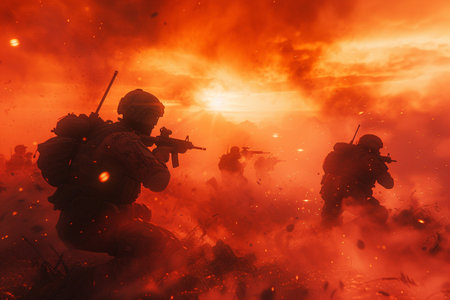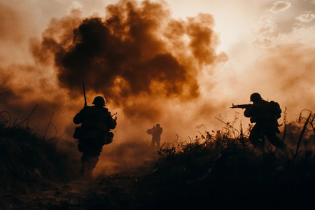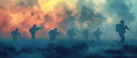 Fighting scenario with military silhouettes against a backdrop of war fog