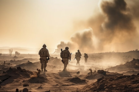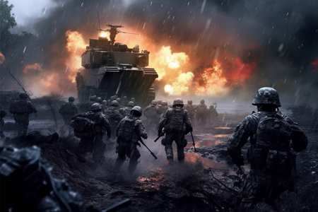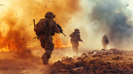 Army soldiers at war. Military forces at special operation. Battlefield with attacking soldiers walking across the field with explosions. Created with Generative AI
