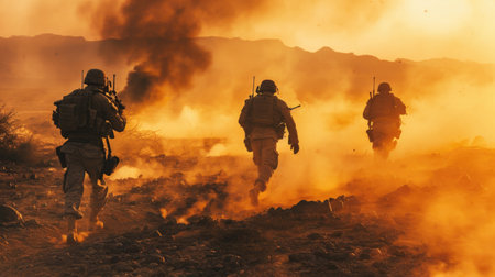 military special forces soldiers crosses destroyed warzone through fire and smoke in the desert