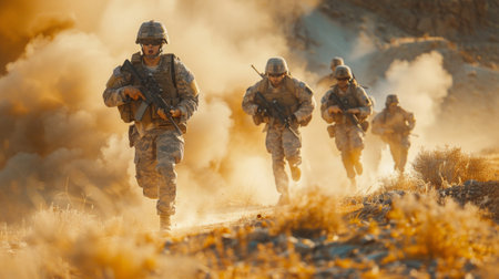 A group of soldiers running through a desert area with a dramatic sky, engaging in a military operation with dust and intensity