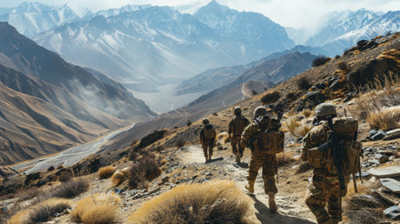 Soldiers on the move through rugged mountain terrain