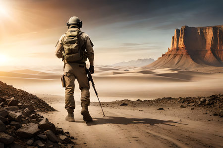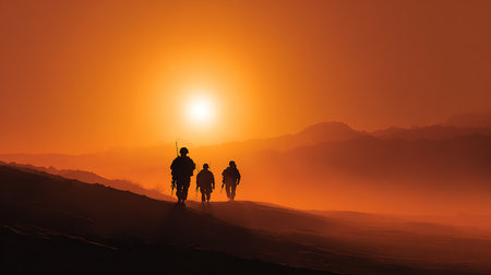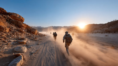 A group of soldiers walks through a dusty desert landscape at sunrise, creating an inspiring scene of teamwork and resilience in a rugged environment.
