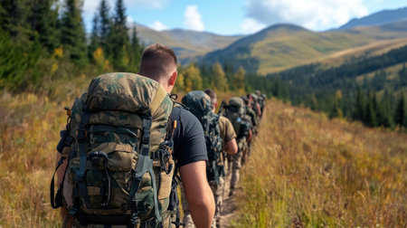 A group of people with backpacks walking through a field, AI
