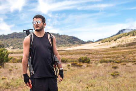 hiker man in black sportswear with crossed arms and confident gaze in the warm savanna of Chirripo National Park in Costa Rica