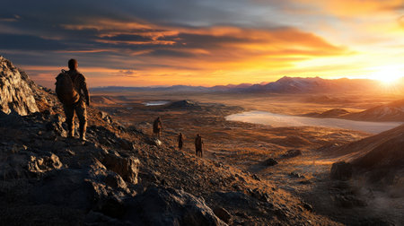 Experience a breathtaking sunrise hike in remote mountains This group adventure offers challenging trails, stunning landscapes, and untamed wilderness Forge lasting memories with friends while exploring unique natural beauty Capture the magic of an unforgettable hiking vacation as the sun paints the sky AI Generative