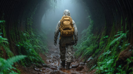 A man in a white suit and yellow backpack is walking through a tunnel. The tunnel is dark and damp, and the man is the only one in the scene. Scene is eerie and mysterious