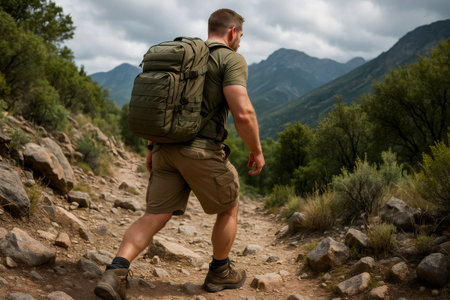 Soldier is hiking on a rocky mountain path, carrying a large backpack during an endurance challenge