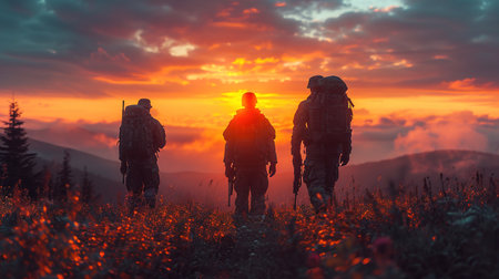 A group of soldiers climbs a rugged hillside surrounded by greenery and fading sunlight. Their focused expressions reveal their commitment to teamwork and perseverance in challenging conditions.