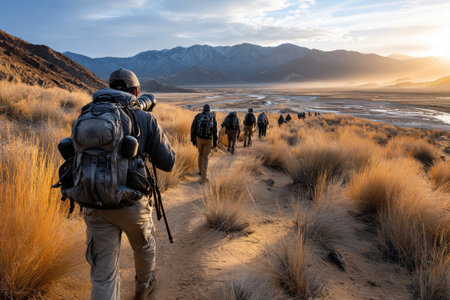 A group of hikers ascend a mountain trail, their backpacks laden with gear, as the sun rises over the distant peaks.