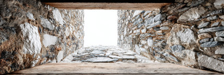 View looking up through a stone structure shows historical elements and open space above for design, branding, or text placement.