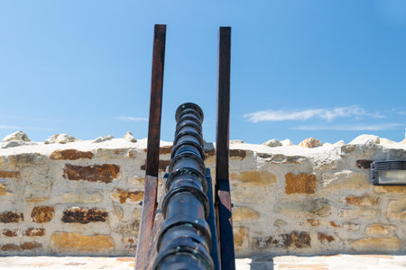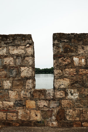 A close-up of the battlement of Smederevo Fortress, Serbia. Openings in the stone wall overlook the Danube River and green forest