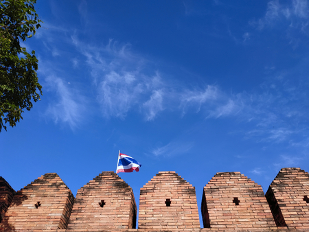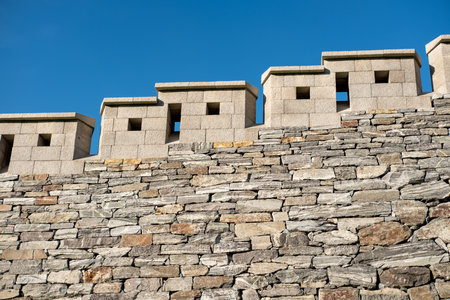 This image showcases an ancient stone wall with battlements, set against a clear blue sky. The wall highlights fine craftsmanship and historical significance.