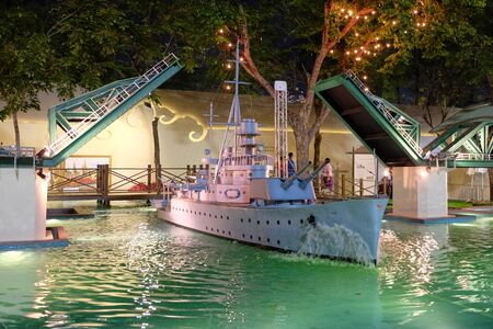Bangkok, Thailand, December 27, 2018. Model of a warship among the artificial pond at night.