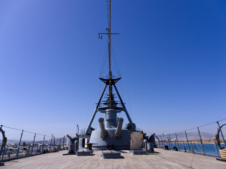 Athens, Greece - March 31, 2023: Georgios Averof battleship and museum outside view in a sunny day. Docked in Flisvos Marina.