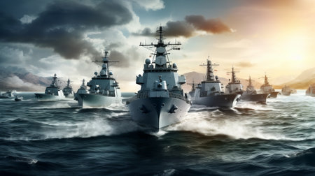 A fleet of warships navigates the ocean, creating waves as the sun sets, illuminating the sky and sea.