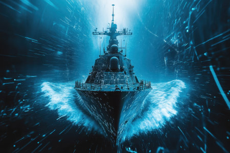 A powerful warship moves swiftly through ocean depths, leaving dynamic waves and bubbles in its wake.