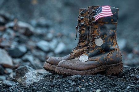 Old military combat boots with tags and a small American flag. Generative AI