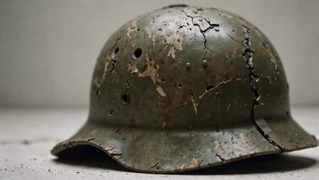A cracked and weathered soldier's helmet on white background. Representing the fragility of war. War and conflict concept. Copy space.