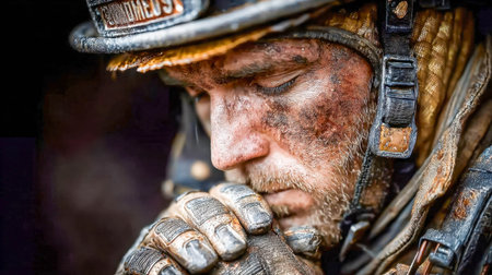 Intense close up of battle weary soldier showcasing profound fatigue and extreme exhaustion
