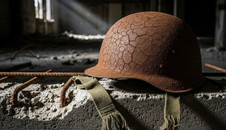 Realistic style photo of an old rusty and cracked military helmet on concrete rubble in the ruins of a destroyed building