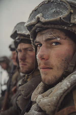 A soldier's determined expression reveals his grit in a snowy war setting.