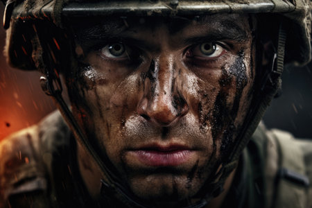Soldier with Muddy Face and Intense Expression in War Zone