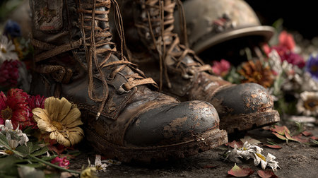 Still life with old military boots, army helmet and flowers. Selective focus.