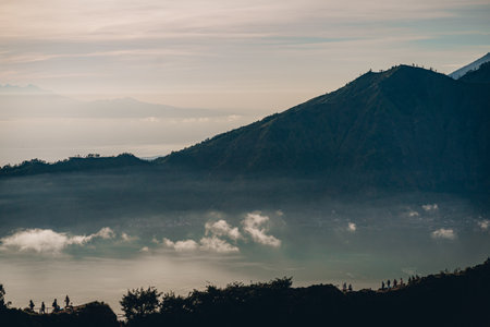 Landscape view of morning clouds and mist at mountain Batur. Sunrise trekking mount volcano Batur