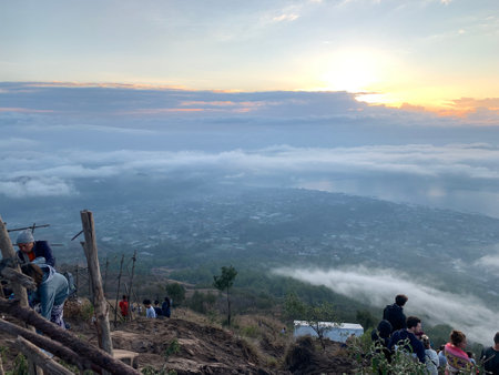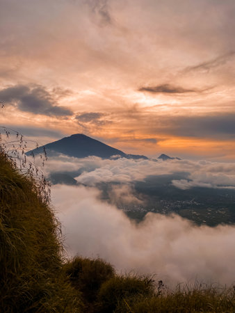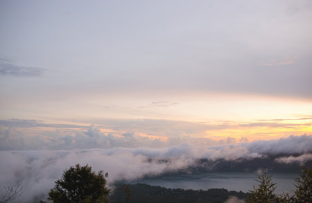 Scenic view of clouds and mist at sunrise from the top of mount Batur Kintamani volcano , Bali, Indonesia.