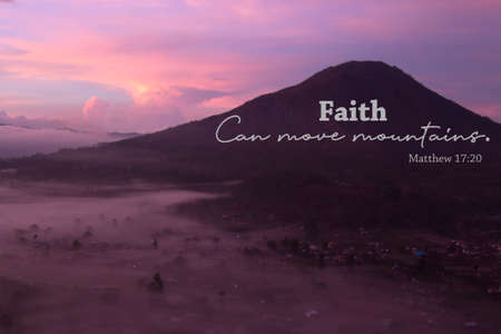 Bible verse quote - Faith can move mountains sunset over the mountains. Matthew 17:20 With mountain view on a misty morning at sunrise background. Faith hope and Christianity love concepts.