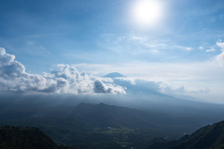 Bright sun shining over agung volcano and green valley in bali, indonesia