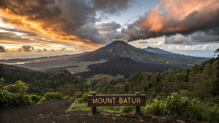 A stunning view of Mount Batur, an active volcano in Bali, Indonesia, at sunrise or sunset. The dramatic sky and lush greenery create a picturesque travel destination scene.