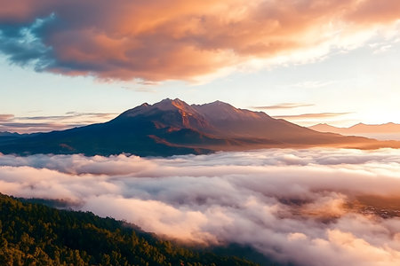 A breathtaking view of a majestic mountain peak rising above a lush forest, enveloped in a soft layer of fog during a stunning sunrise. A true testament to nature's beauty.
