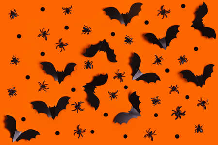 Halloween background, decorations and scary concept. Black bats fly over orange background. top view