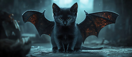 A black cat with crafted bat wings sits ominously in a dimly lit, moody environment, evoking Halloween themes