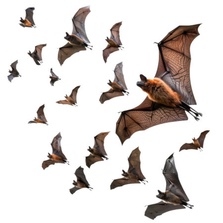 A group of bats flying in formation against a black background, showcasing their intricate wing structure and nocturnal nature.