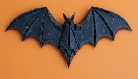 Detailed black origami bat artfully arranged against a bright orange backdrop, highlighting craftsmanship and design.