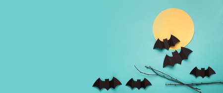 Halloween banner background. Black bats cut from paper on a blue background. Halloween decor and decorations for the holiday, copy space.