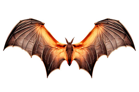 a bat flying away, captured in a large-scale photography installation, is depicted in this image. the bat is isolated on a white background, with a charming and exotic style of light brown and crimson colors. the trompe l'oeil technique adds depth to the haunting figuratism of the image. ai generated