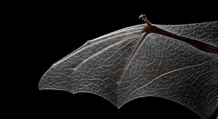 A close up of a bat's wing on a black background.