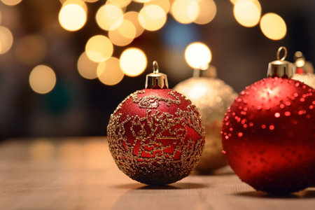 A cozy Christmas scene featuring red and silver ornaments illuminated by soft, golden bokeh lights, creating a warm and festive atmosphere.