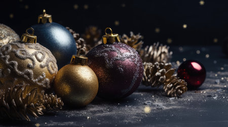 Colorful Christmas baubles on a dark background with copy space