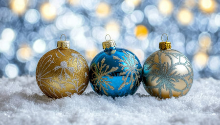 Stunning gold and blue christmas ornaments on snow with twinkling lights and bokeh background