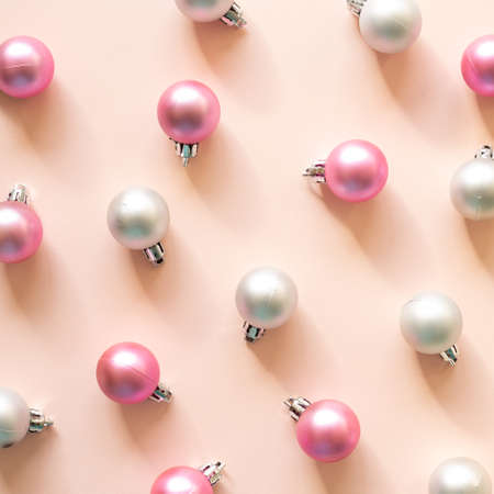 Christmas ornaments. Pink and silver baubles on pink background. flat lay, top view