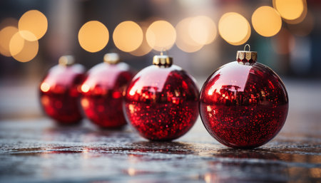 Red Christmas baubles with glitter details on a wet surface, sparkling with golden bokeh lights.