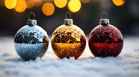 AI Generated. Festive red ornaments surrounded by snow and winter lights at dusk